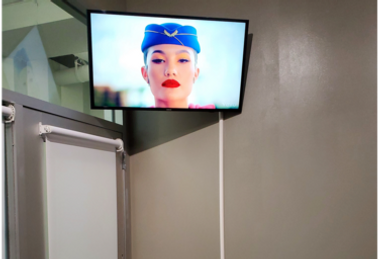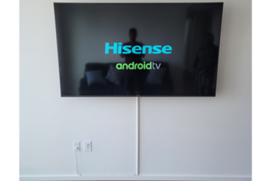 Create new power source in wall, behind TV. Run client provided cables in wall. Cables can be provided for an additional cost. Add proper wall plates and covers. price may increase due to unforeseen issues